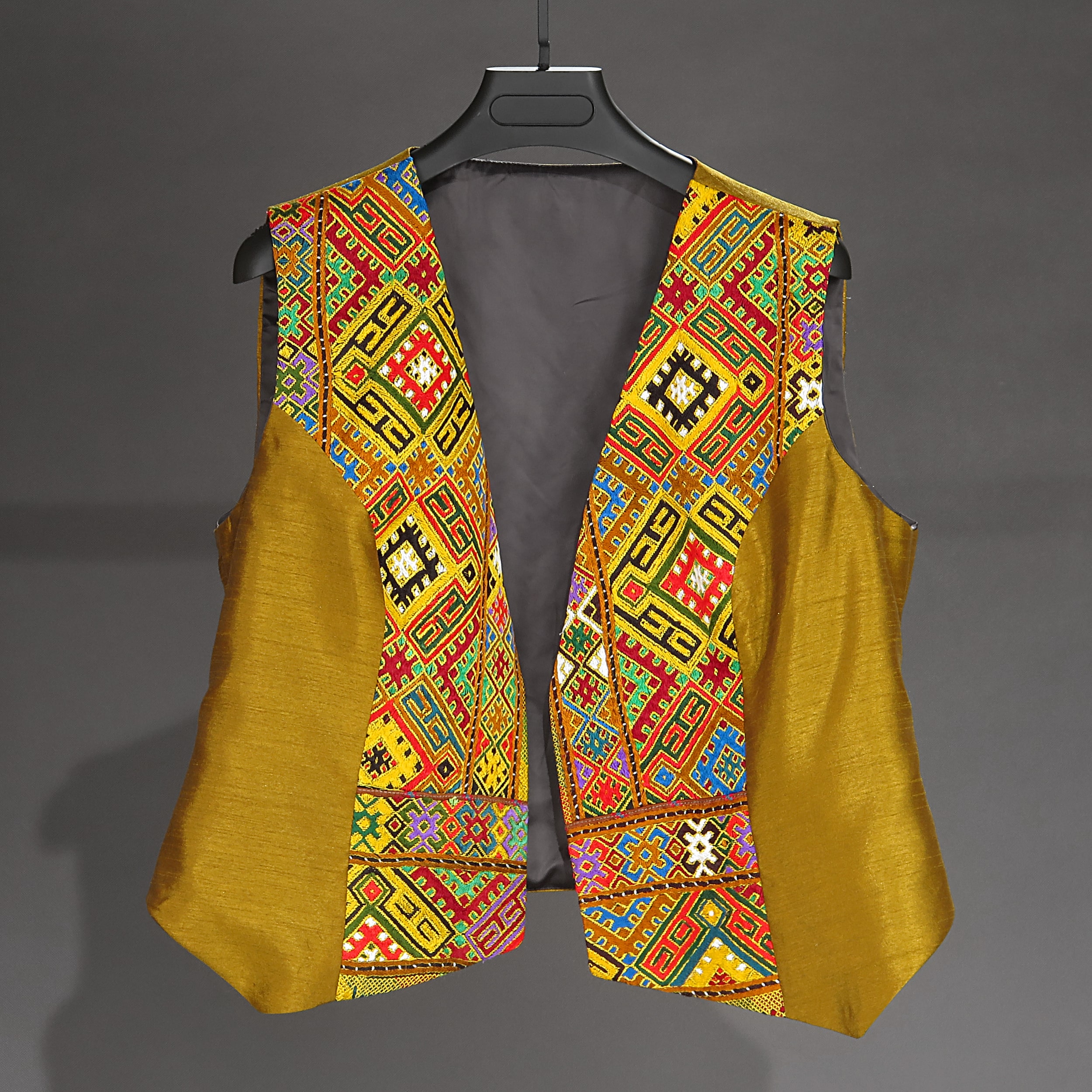 - پنلهای کناری پارچهای: کنارههای جلیقه، از پارچهای ساده و براق به رنگ طلایی، خردلی یا نارنجی تیره (احتمالاً ابریشم یا ساتن) ساخته شدهاند. این ترکیب پارچه ساده با بخشهای سوزندوزی پرکار، به جلیقه توازن بصری میبخشد و بر زیبایی هنر دست تأکید میکند.