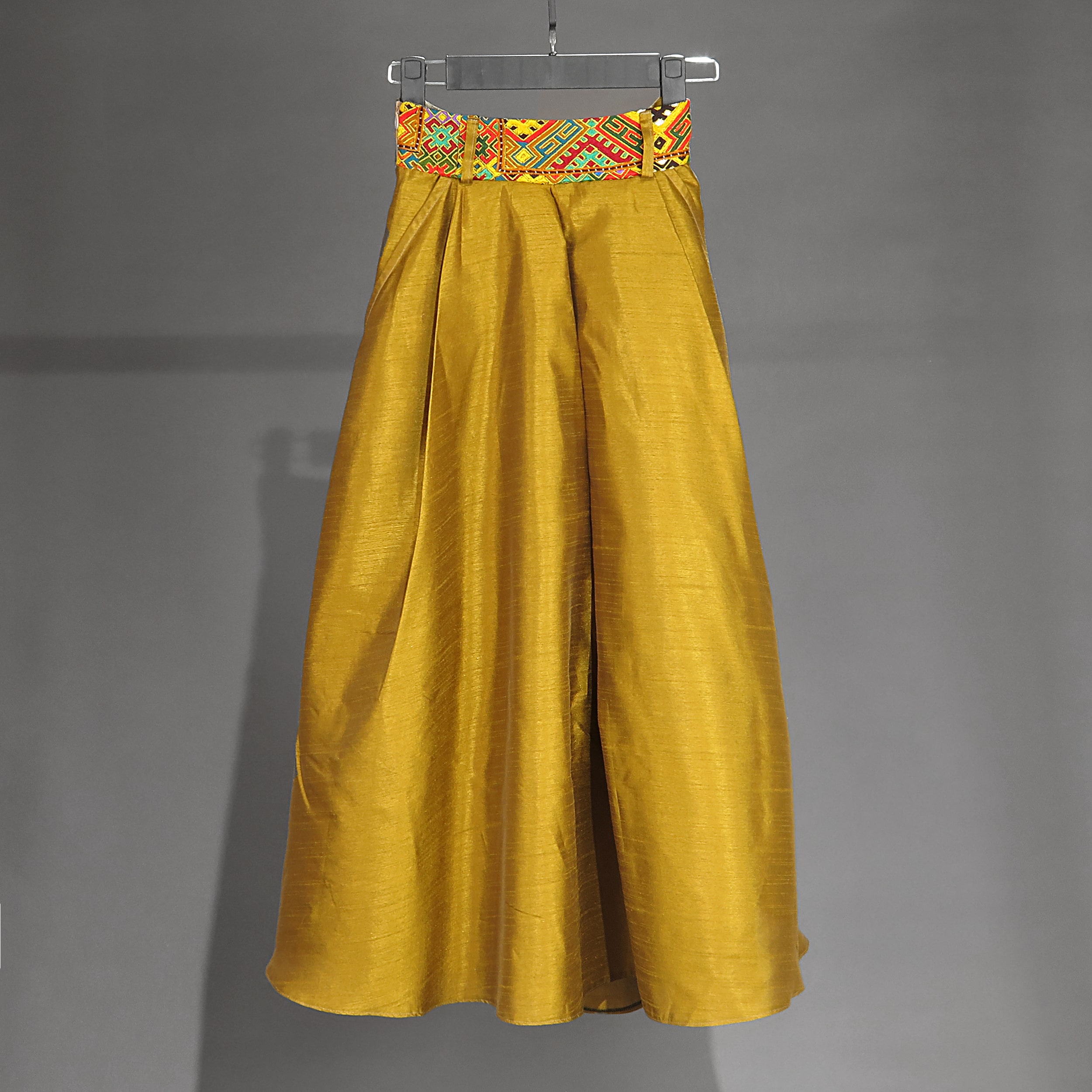 - پارچه دامن ابریشمگونه و درخشان: دامن از پارچهای با کیفیت بالا و براق به رنگ طلایی، خردلی یا نارنجی تیره دوخته شده است که به نظر میرسد از جنس ابریشم، ساتن یا پارچههای شانتون باشد. این پارچه، با درخشش و ریزش زیبای خود، جلوهای لوکس و فاخر به دامن میبخشد.